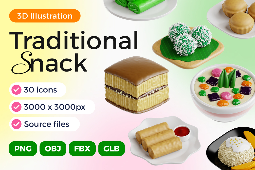Elevate your mobile app, UI/UX, and web design projects with the Traditional Snack 3D Illustration, adding a unique and eye-catching element to your designs.