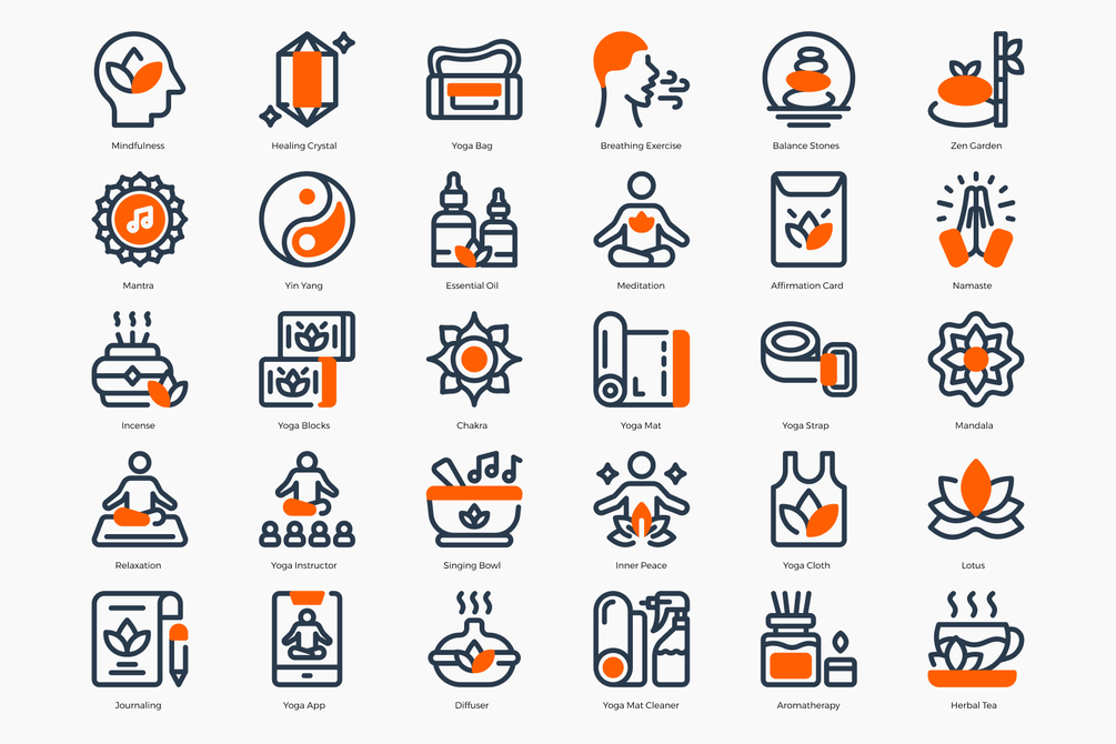 Included Icons: Affirmation Card, Aromatherapy, Balance Stones, Breathing Exercise, Chakra, Diffuser, Essential Oil, Healing Crystal, Herbal Tea, Incense, Inner Peace, Journaling, Lotus, Mandala, Mantra, Meditation, Mindfulness, Namaste, Relaxation, Singing Bowl, Yin Yang, Yoga App, Bag, Yoga Blocks, Yoga Cloth, Instructor, Mat, Mat Cleaner, Yoga Strap, Zen Garden