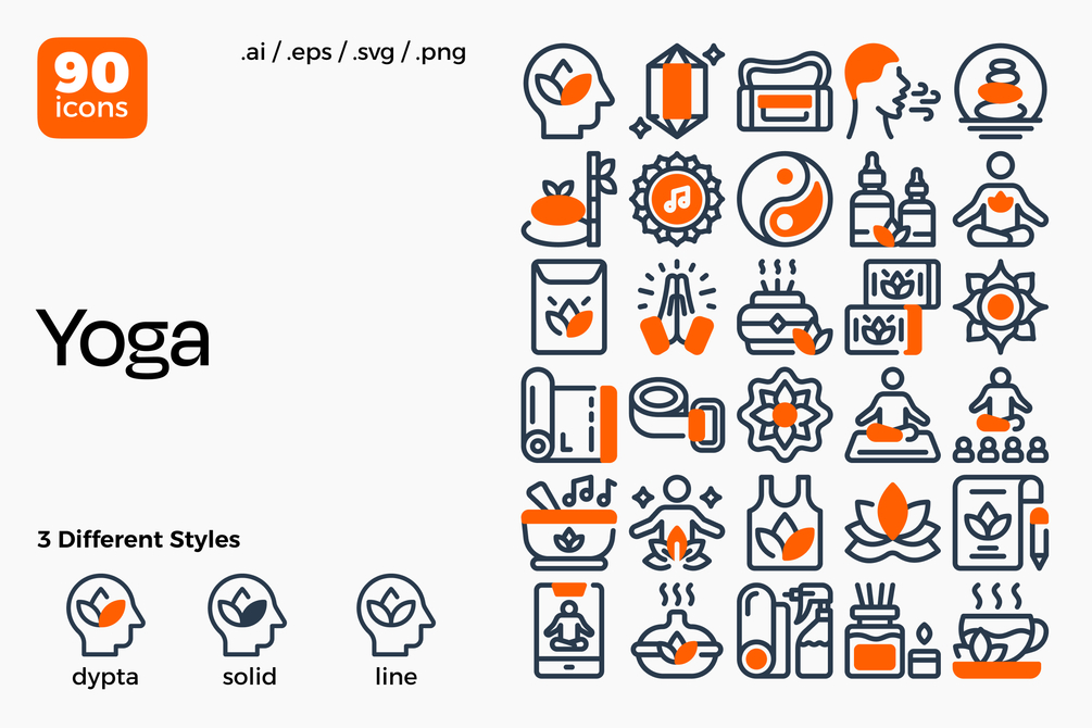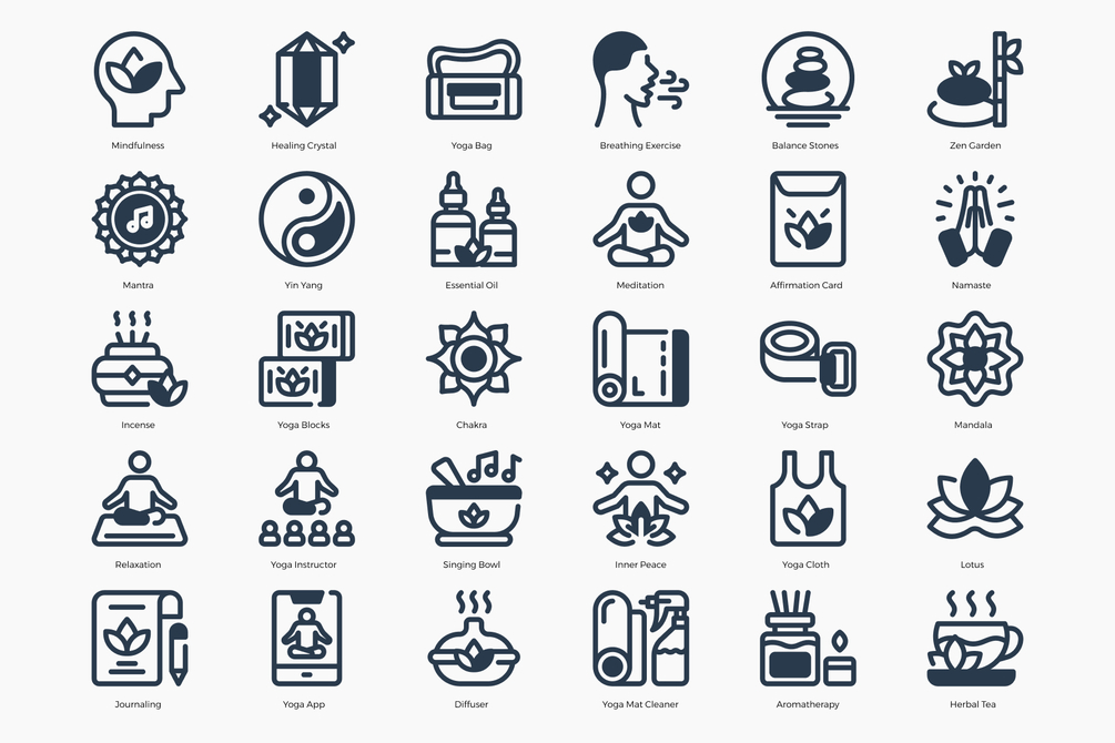 Included Icons: Affirmation Card, Aromatherapy, Balance Stones, Breathing Exercise, Chakra, Diffuser, Essential Oil, Healing Crystal, Herbal Tea, Incense, Inner Peace, Journaling, Lotus, Mandala, Mantra, Meditation, Mindfulness, Namaste, Relaxation, Singing Bowl, Yin Yang, Yoga App, Bag, Yoga Blocks, Yoga Cloth, Instructor, Mat, Mat Cleaner, Yoga Strap, Zen Garden